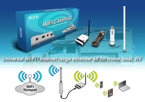 Wide Range Wi-Fi Solution for RVs, campers, and yacht Internet access Combining well-known R36 portable WiFi router, Tube series outdoor USB wireless adapters, and high sensitivity outdoor antenna AOA-2409 from ALFA network, Camp Pro brings the most convenient, extended wireless access whenever you're in a camping site or on a boat. With CampPro, the remote wireless can easily be fetched by the connected Tube USB wireless adapter, and R36 broadcasts the signals to your desktop/laptop computers, smartphone/tablet device for Internet access.Feature