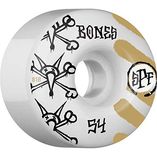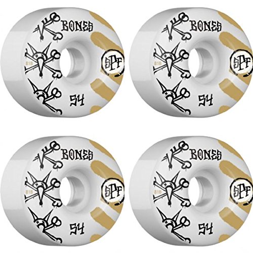 -. Feature : One (1) set of 54mm Bones Wheels War Paint Skateboard Wheels; includes four (4) wheels / Diameter: 54mm / Durometer: 81b / Color: White / Gold