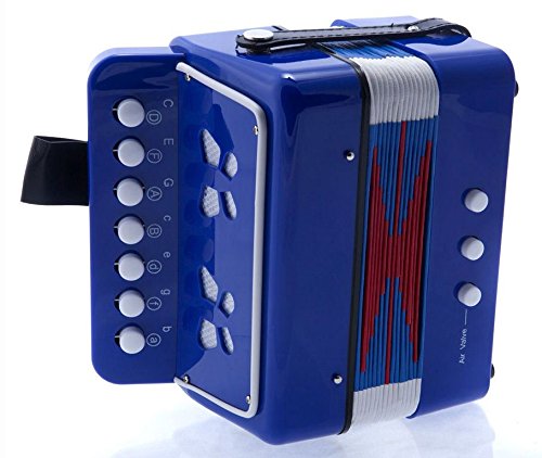 This adorable children's Accordion is ideal for toddlers and kids. This Child's Accordion features 7 treble buttons and 2 bass buttons. This toy Accordion makes a wonderful gift for that special child and is a great value for the money! The accordion projects a nice warm accordion sound that's sure to entertain! Available in Black, Blue, Red, and Green.