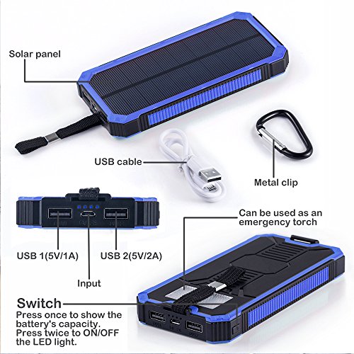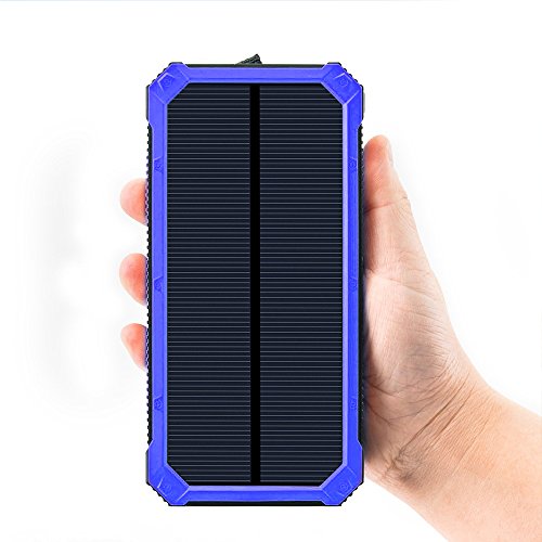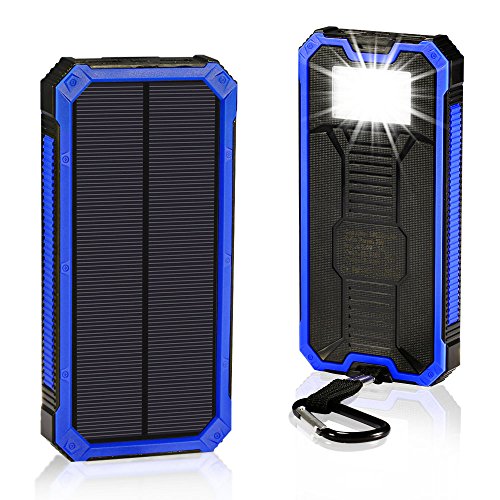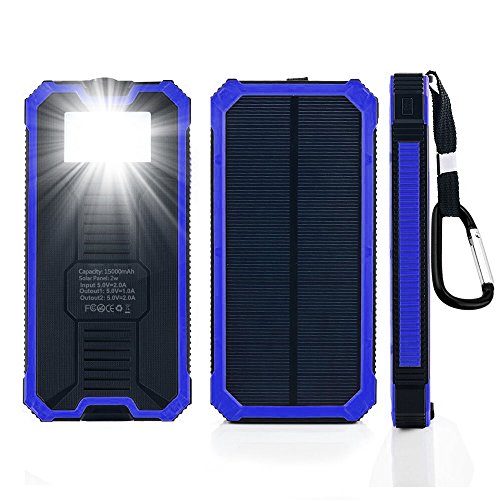 Solar Chargers 15000mAh, GRDE Portable Dual USB Solar Battery Charger External Battery Pack Phone Charger Power Bank with Flashlight for Smartphones Tablet Camera (Blue)