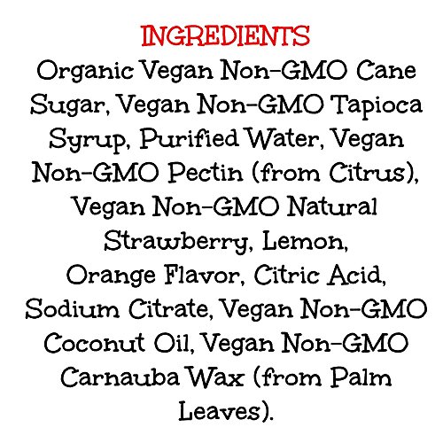 From Wild Organic Lichen, Certified Organic Cane Sugar, Tapioca Syrup, Purified H20, Pectin, Natural Flavors (Lemon, Orange, Strawberry) Citric Acid, Sodium Citrate, Natural Colors (Annatto Extract, Black Carrot), coconut Oil, Carnauba Wax.