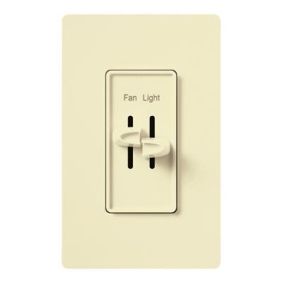 Lutron S2-LFSQH Skylark Dual Light/Quiet Fan Al Fan Control (Left) Slide up to On/Increase Speed, Downto Decrease/Off 3 Quiet Fan Speeds for Increased Comfort For use with only One Ceiling Paddle Fan Dimmer (Right) Slide up to On/Brighten, Down to Dim/Off Clamshell Package Wall Plate Not included 3-Speed Quiet Control Finish: Almond Type: Gloss Single Pole Slide to Off 1 Gang