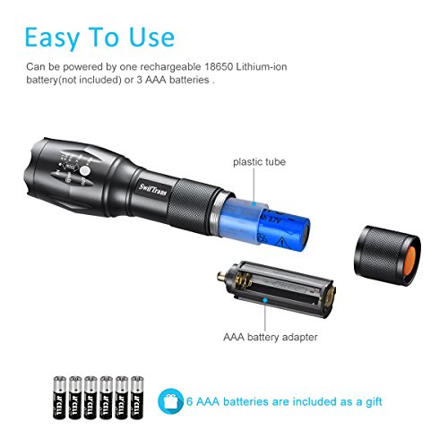 Studio : swiftrans Publisher : swiftrans Binding : Misc. Product Description Swiftrans Tactical A100 LED Flashlight Specification Powerful CREE Led T6 chip boasts a maximum 800 lumens with a lifespan of up to 50,000 hours Focus on objects up to 1000 feet away or zoom out to sweep a large area. 5 adaptable modes: high,medium,low,strobe,SOS. Copper surfaced battery contacts effectively avoid bad contact. Anti-roll,anti-slip design Made of durabe aircraft-grade aluminum alloy Cooling fins ensure?good?heat dissipation?performance. Constructed with crenellated attack head for enhanced self-defence. Hard-anodized finish for extreme abrasion, scratch and correcton resistance. O-ring selaled for water resistance The end cap is sealed with superior natural rubber to help maintain skid and water resistance . Powered by 3 included AAA batteries or one 18650 rechargeable Lithium-ion battery(not included). The best output brightness was powered by 18650 battery. Dimensions: 5.35"(L) x 1.38" (Head Dia.) x 1.1" (Body Dia.) Package 2*Swiftrans A100 Tactical LED Flashlights 2* Lanyards(attached) 6* AAA Batteries 2*AAA Battery Adapters for Using AAA Batteries 2*18650 Plastic Battery Sleeves (battery not included) Safety Warning Be cautious when activating the flashlight or when changing to strobe mode. Never point the flashlight at anyone's eyes. Warranty If you have any problems or not satisfied with this LED flashlight, please feel free to contact us to request a refund or replacement. We'll try our best to guarantee your 100% satisfaction. 0