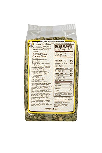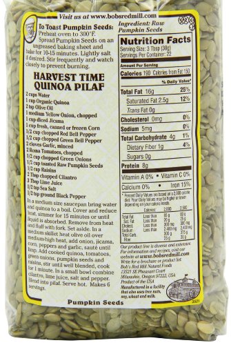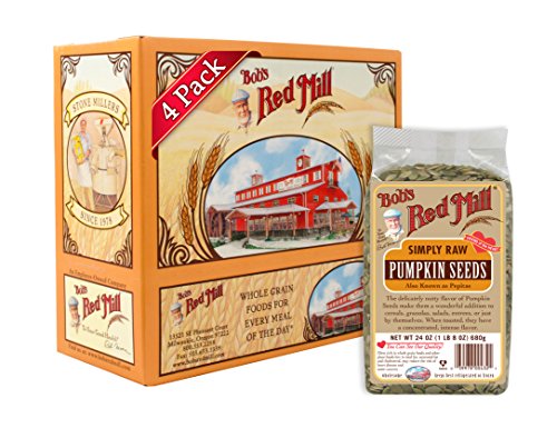 -. Binding : Grocery -. Brand : Bob's Red Mill -. EAN : 0884539204203 -. Feature : Case of four 24-ounce packages (96 total ounces) / Made from 100% all-natural raw pumpkin seeds / Rich in protein and minerals such as potassium and iron / Strong flavor makes for an ideal snack; or sprinkle into cereals or salads / Packaged in Milwaukie, Oregon -. Label : Bob's Red Mill -. Manufacturer : Bob's Red Mill -. NumberOfItems : 4 -. PackageQuantity : 4 -. ProductGroup : Grocery -. ProductTypeName : GROCERY -. Publisher : Bob's Red Mill -. ReleaseDate : 2006-01-26 -. Studio : Bob's Red Mill -. Title : Bob's Red Mill Pumpkin Seeds, Raw, 24-Ounce Packages (Pack of 4) -. UPC : 884539204203