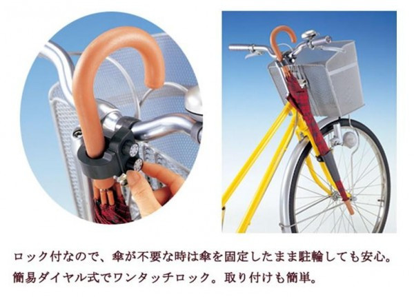 | ロック付なので、傘が不要な時は傘を固定したまま駐輪しても安心。簡易ダイヤル式でワンタッチロック。取り付けも簡単。バッグの紐をロックすればひったくり防止にもなります。 |