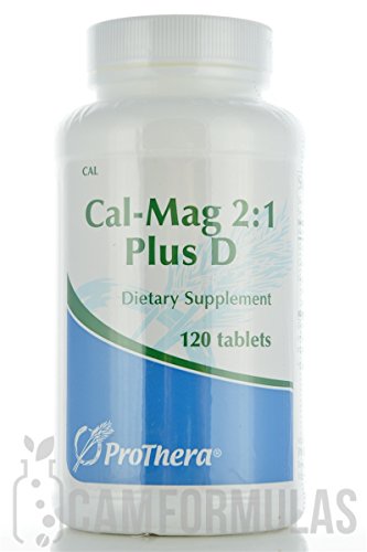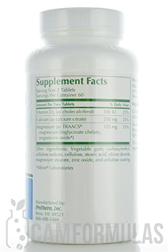 Cal-Mag 2:1 Plus D 120 tabs Dietary Supplement ProThera products may only be purchased by Health Care Professionals. Patients who want to buy ProThera products may obtain them from their Health Care Professional. Cal-Mag 2:1 Plus D provides easy-to-absorb forms of calcium and magnesium along with natural vitamin D3. Suggested Use: 2 to 4 tablets daily with food. Supplement Facts Serving Size 2 Tablets Servings Per Container 60 Vitamin D3 (as cholecalciferol) 100 IU Calcium (as calcium citrate) 250 mg Magnesium (as TRAACS magnesium bisglycinate chelate magnesium oxide) 125 mg Other ingredients: Vegetable gum carboxymethylcellulose sodium cellulose stearic acid silicon dioxide magnesium stearate zinc oxide and cellulose coating. Free of the following common allergens: milk/casein eggs fish shellfish tree nuts peanuts wheat/gluten corn yeast and soybeans. Contains no artificial colors flavors or preservatives. Do not use if full-bottle shrinkwrap is broken or missing. Store in a cool dry place (59 F-85 F) away from direct light. KEEP OUT OF REACH OF CHILDREN.Feature
