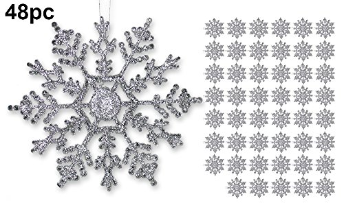 - 4 INCH SNOWFLAKES. This set of 48 shiny and bright silver glitter covered snowflake ornaments are just the perfect addition to any Christmas decorations.