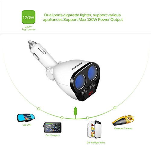 ONEVER 1 to 2 Sockets Cigarette Lighter Splitter, Dual USB Car Charger Adapter with Voltage Display Compatible for iPhone7 7s iPad mini Samsung Galaxy, 12-24V Voltage, Suitable for Various Cars