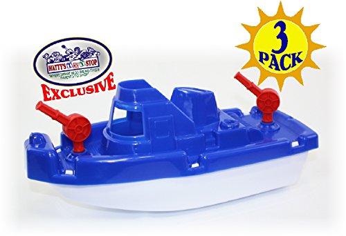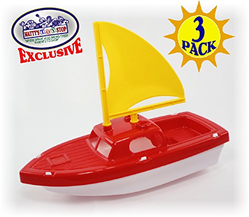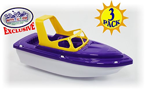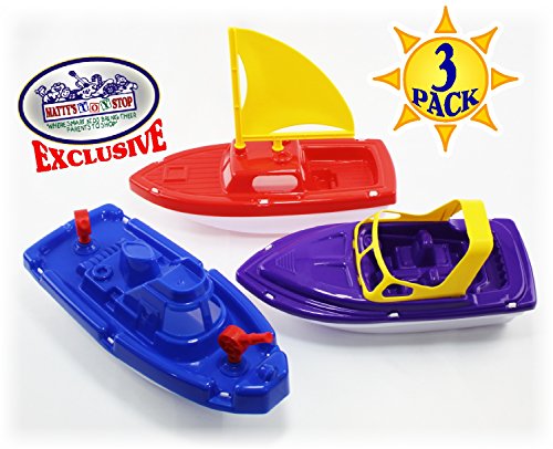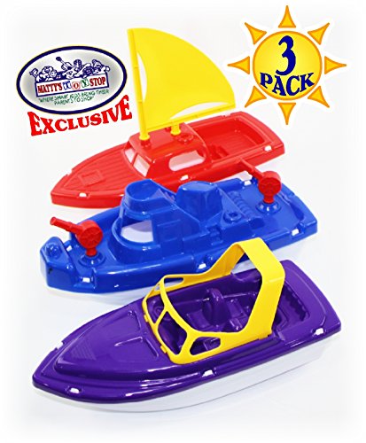 Matty's Toy Stop Plastic Boats Set Sailboat (Red), Speedboat (Purple) & Fireboat (Blue) Gift Set Bundle, Perfect Bath, Pool, Beach Etc. - 3 Pack, is AWESOME! Gift Set Bundle Includes 3 Awesome Plastic Boats for the Tub, Bath, Pool, Beach, Water Table or Anywhere Else You Can think Of That's Wet! Set includes one each of Sailboat (Red), Speedboat (Purple) & Fireboat (Blue)! Exact colors shown. These boats are lightweight, yet durable, making them the perfect toys to bring along for the ride to the beach or pool! Makes a great gift & is perfect for schools, party favors, stocking stuffers, baskets, special needs, promotions and so much more! For Ages 3 and up - Fun for the whole family! - Boats Measure Approx. 11" Long x 4.25" Wide x 5" Tall.Feature