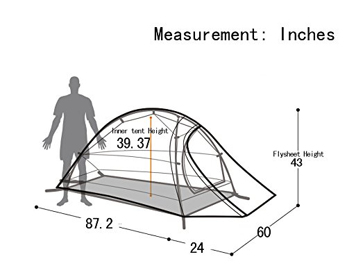• PORTABLE BACKPACKING TENT. ULTRALIGHT. TOTAL WEIGHT: 4 lbs / 1.81KG. PACKAGE SIZE: 4.3x4.3x17in / 11x11x43cm. Floor: (83+24)*49 in / (210+60)x125 cm. Height: 39.37in / 100cm.