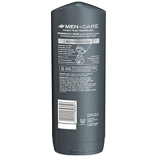 -. Binding : Health and Beauty -. Brand : Dove -. EAN : 0011111657618 -. Feature : Dove Men+Care minerals and sage body wash hydrates for healthier, stronger skin / Infused with nature's refreshers, minerals and sage / Gives a boost of freshness that leaves you feeling renewed / Sage, peppermint and eucalyptus provide an energizing yet comforting scent / Dove men's body wash is developed specifically for men's skin -. Label : Unilever -. Manufacturer : Unilever -. NumberOfItems : 1 -. PackageQuantity : 1 -. ProductGroup : Pantry -. ProductTypeName : BEAUTY -. Publisher : Unilever -. Studio : Unilever -. Title : Dove Men+Care Elements Body and Face Wash, Minerals and Sage 18 oz -. UPC : 011111657618