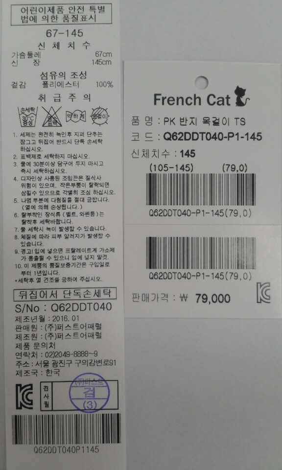 제조자 : (주)퍼스트어패럴
