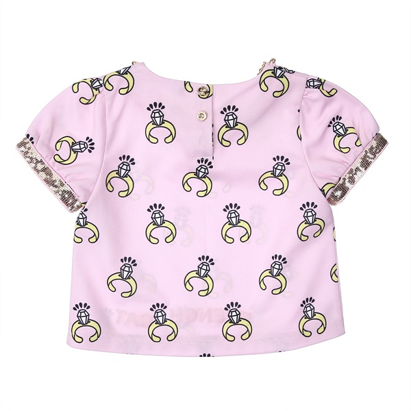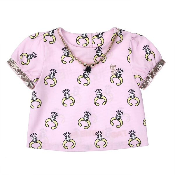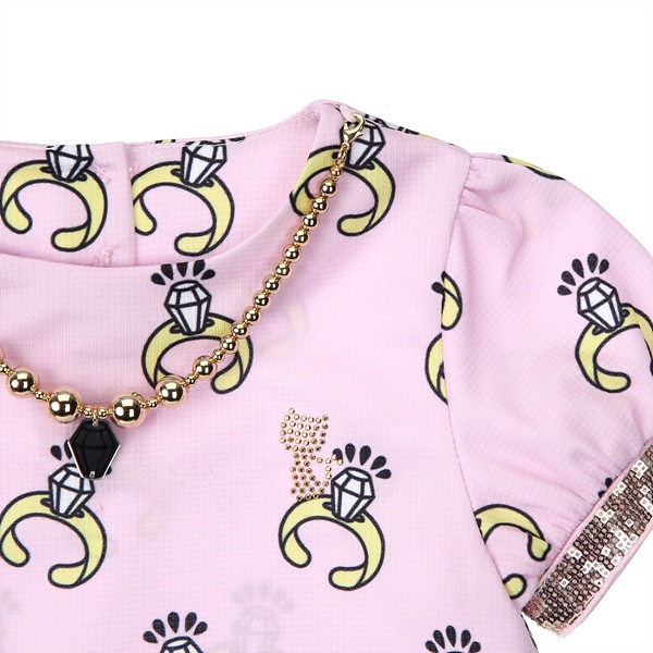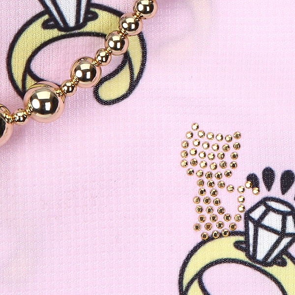 상세설명 : ※모니터 해상도, 밝기, 컴퓨터 사양 등에 따라 실물과 약간의 색상차이가 있을 수 있습니다. 핑크 반지나염 목걸이 티셔츠입니다.. 단순하면서도 세련되게 표현된 반지패턴위에 블링블링한 골드볼 목걸이와 스팽글 테이프로 핑크 컬러감에 화사함을 더해주었어요. 같은 패턴의 스커트와 투피스 개념으로 입어주셔도 너무 예뻐요