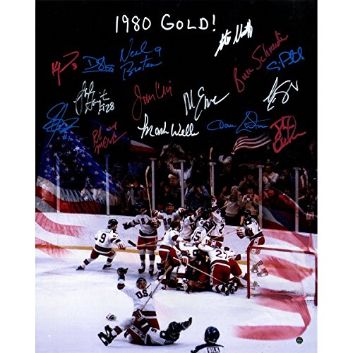 1980 USA Men's Hockey Team Signed 16x20 Blacked Out Photo w/ "1980 Gold" Inscription by Mark Wells (15 Signatures- Signed in Red/White/Blue)
