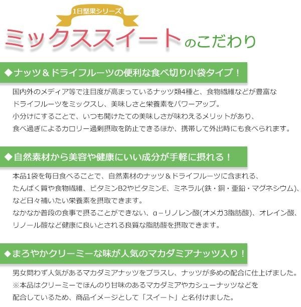 | ナッツ&ドライフルーツを一定配合でミックスし、便利な食べ切り小袋タイプにしました!日々補いたい栄養素を簡単に摂取することができます。クリーミーな味が人気のマカダミアナッツをプラスし、ナッツが多めの配合に仕上げました! |