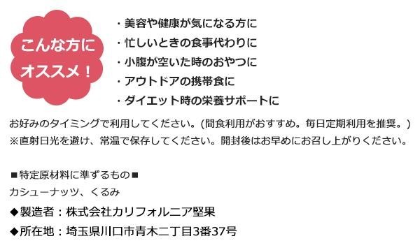 | 原材料 | アーモンド(アメリカ産) カシューナッツ(インド産) 乾燥クランベリー(アメリカ産)、砂糖、植物油脂 くるみ(アメリカ産) マカダミアナッツ(オーストラリア産) |