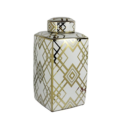 Sagebrook Home Decorative Ceramic Square Covered Jar, White, 9.25x9.25x18, Gold