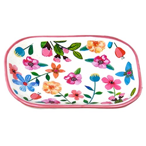 -. Feature : Bathroom and bedroom décor and accessories don't always have to be bland, single color items. / Your bathroom or bedroom needs a bit of decorative love, too, so incorporate a little color with this fun, floral patterned trinket tray to liven it up. This ceramic tray is perfect for rings, jewelry and other little things. / Green, orange, blue and red flowers on a crisp white background make up the P.R.Int of this accessory, allowing it to be used as a beautiful way. / It is also perfect for putting on display to add color to your space. / Measures 4-3/4 inches by 3-1/2 inches and stands ¾ tall.