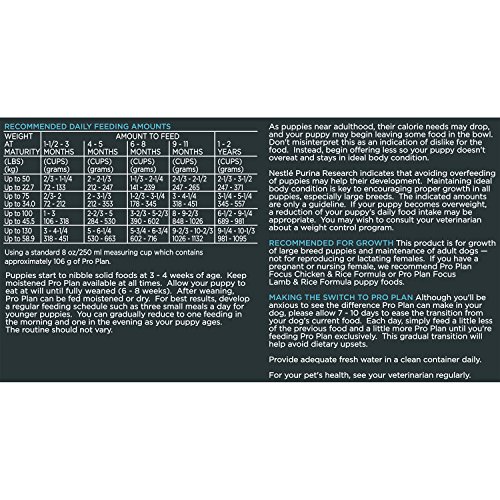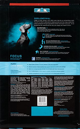 -. Binding : Misc. -. Brand : Purina Pro Plan -. Feature : Specially formulated food for puppies weighing more than 50 lbs. at maturity / First ingredient is protein-rich chicken / Natural sources of glucosamine support joint development / DHA supports eye and brain development / Antioxidant-rich puppy food supports healthy immune systems -. Label : Purina Pro Plan -. Manufacturer : Purina Pro Plan -. MPN : 13264 -. PackageQuantity : 1 -. PartNumber : 13264 -. ProductGroup : Pet Products -. ProductTypeName : PET_SUPPLIES -. Publisher : Purina Pro Plan -. Studio : Purina Pro Plan -. Title : Purina Pro Plan Focus Puppy Large Breed Dry Dog Food
