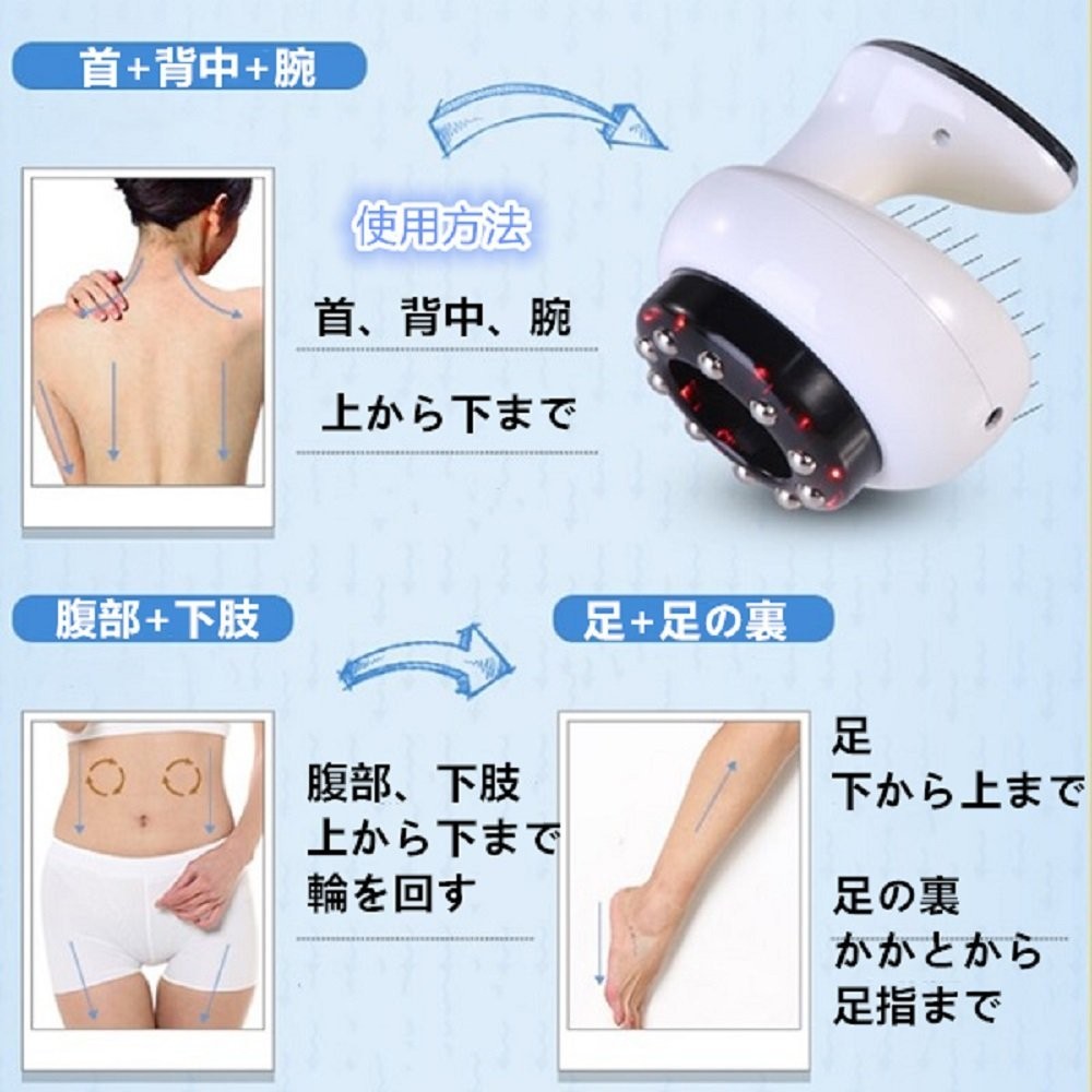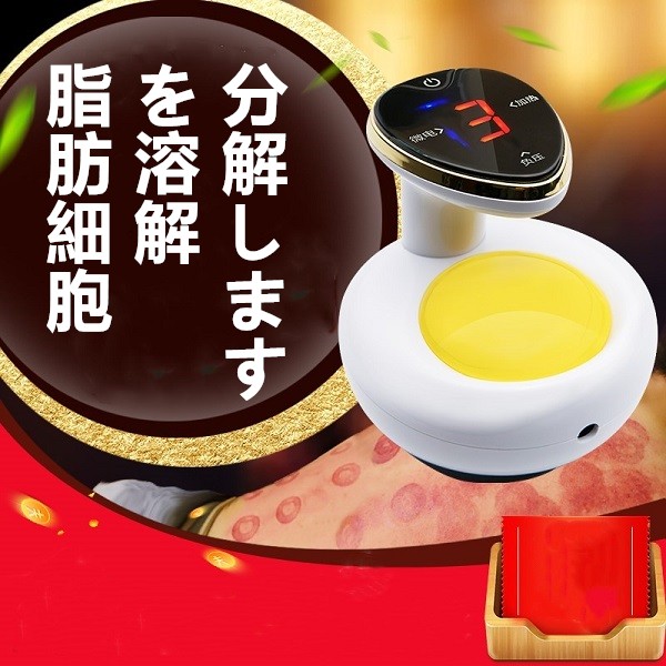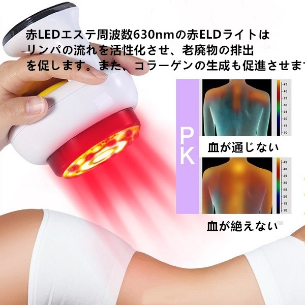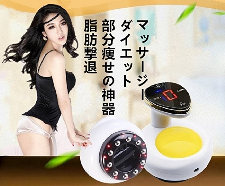 脂肪撃退、部分痩せの神器!1機4役!●RF温熱機能+振動マッサージRF (ラジオ波) の高い周波数で脂肪が溶解しやすい温度まで温めて、振動マッサージでほぐします。●赤LEDエステ周波数630nmの赤ELDライトはリンパの流れを活性化させ、老廃物の排出を促します。また、コラーゲンの生成も促進させます。●脂肪吸引の仕組み吸玉ヘッドにより発生した吸着力で、間質液の中に気泡をつくり、その気泡の破裂によって脂肪細胞を溶解・分解します。●EMSパルスEMSとは、精密的な微電流で穴位に刺激し、経絡疎通、筋肉の弾性と活力を鍛える。セルライトとは、脂肪細胞に老廃物がくっついてどんどん 肥大していった恐ろしいもの(見た目もボコボコ…)ですが それもじわりと温めながら解消していきます。 過度な運動や食事制限で、ストレスをためながらダイエットするより バランスよく食べながら、自宅でのんびりキレイにダイエットする ほうが断然いいですよね。 キャビテーションはシェイプエステサロンでも取り入れられている新しい技術。 最先端の技術を、自宅でじっくり行って確実なメリハリボディを 手に入れることができるのです。
