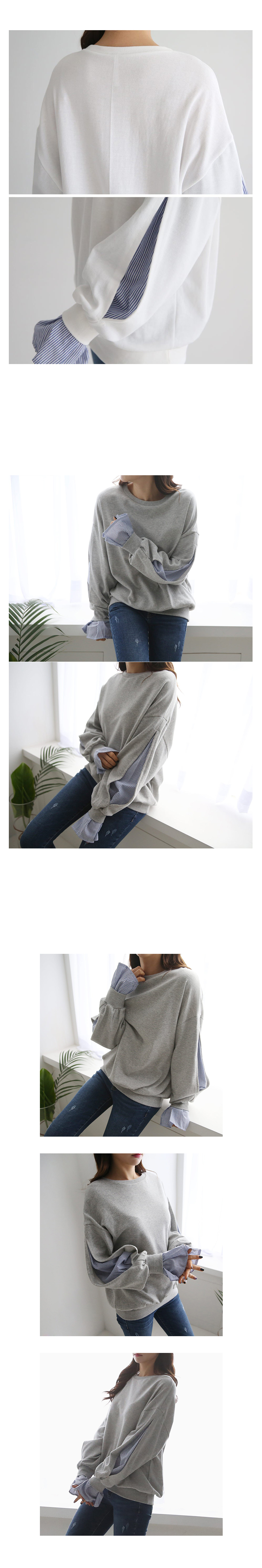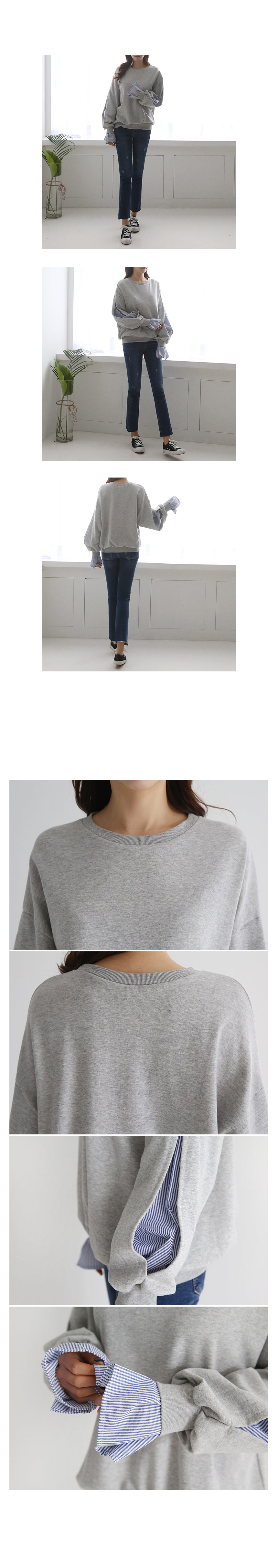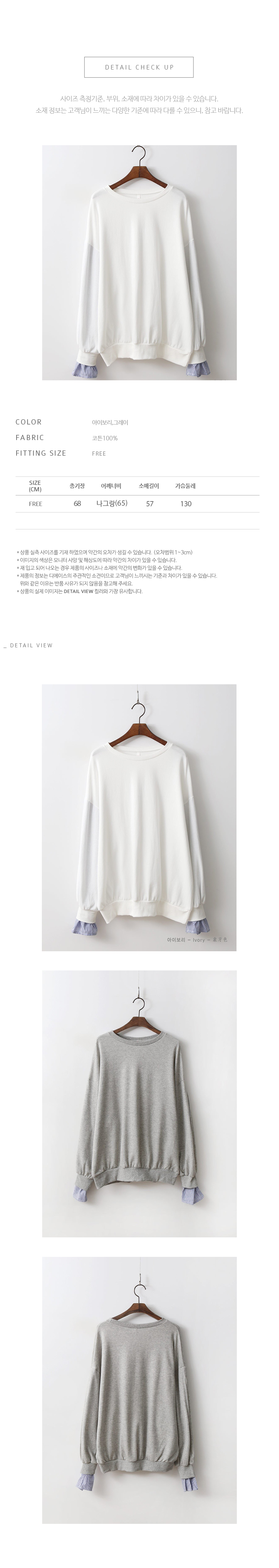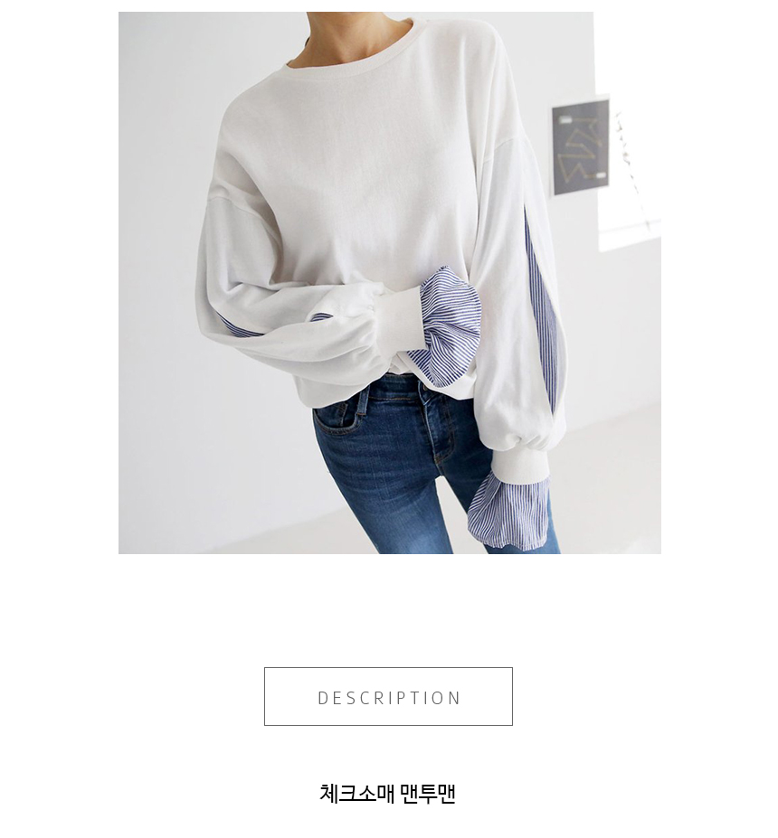 편안하게 떨어지는 내추럴 핏의 기본 맨투맨 스타일에 소맷단과 트임 사이로 스트라이프 배색 안감을 넣어 독특한 포인트를 준 아이템이에요 움직일 때마다 소매 트임 사이로 보이는 스트라이프 패턴은 소맷단에 퍼지듯 디자인된 커프스 느낌으로 마무리해 깔끔하고 멋스럽답니다 심플한 하의에 편안한 룩으로 코디하기 좋은 맨투맨이에요 색상은 아이보리, 그레이 사이즈는 FREE44~66반