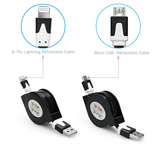 1*8 Pin Apple Retractable Cable and 1*Micro USB Retractable Cable - Ideal for Iphone 6/6 Plus, 6S/6S Plus, Ipad, Any Micro USB Powered Device Including Bluetooth Headsets, BlackBerry, Motorolla Droid X, HTC EVO 4G, Samsung Captivate, and Other Smart Phones. The retractable designed cable will hep you save many space when you charging your electronical device.