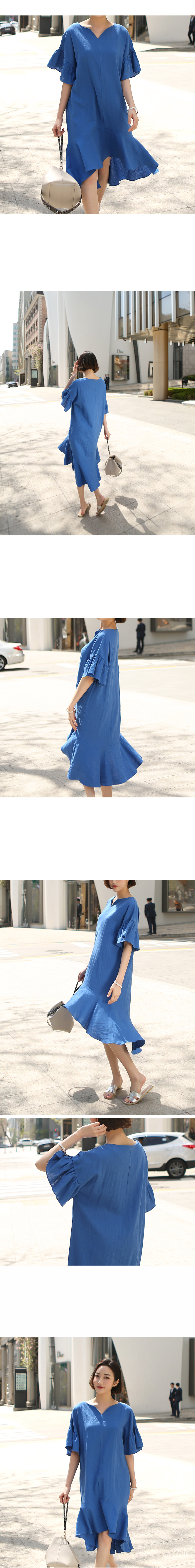 살짝 브이라인으로 네크라인을 틔워주고 드롭된 어깨선 아래로 덧대어진 플레어라인이 팔랑이며 여성스러워요