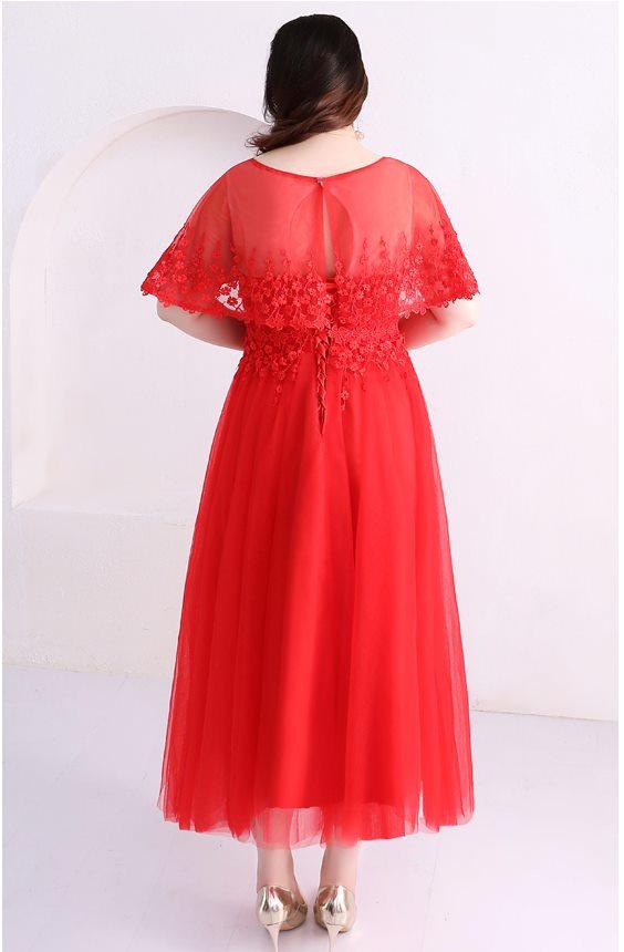 体型カバーとエレガント見せを両立するレースケープ風ワンピース。