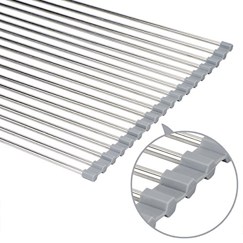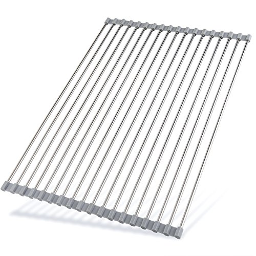 -. Title : Roll Up Dish Drying Rack - 20.5"(L) x 14"(W) Stainless Steel and Silicone Dish Drying Mat Over the Sink Foldable Drain Rack Multipurpose Dish Drainer Extra Large, Gray