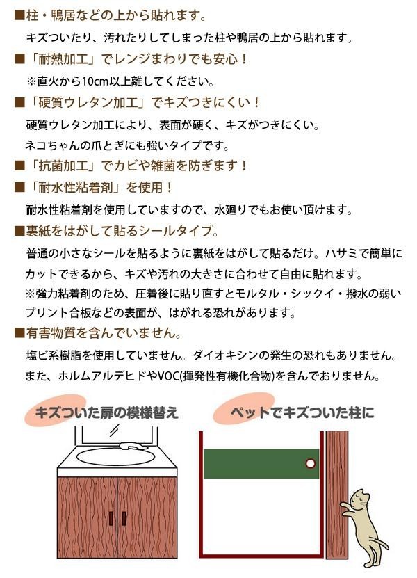 | 木目タイプの硬質ウレタン加工が施されたシートです。キズのついた扉の模様替えや、ペットにキズつけられら柱などにお使いください。 |
