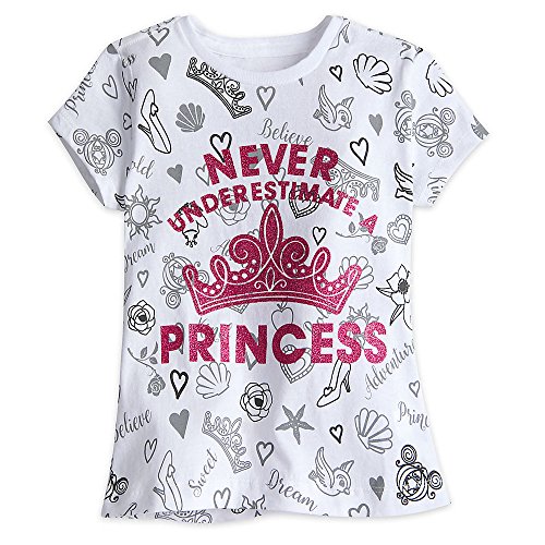 Genuine, Original, Authentic Disney Store Allover Princess icon print pattern Glitter text Short sleeve Ribbed crew neck Brand : Disney Item model num : 456214828006 MPN(PartNumber) : 00-6LLJW6-2N Package Dimensions(LxWxH) : 21x20x3cm ; 86 g