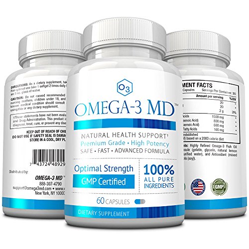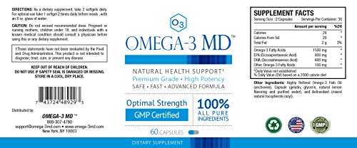 Omega-3 MD™ is a clinical strength, 100% pure omega-3 supplement, scientifically formulated to contain 800mg of EPA (Eicosapentaenoic Acid) and 600mg of DHA (Docoasahexaenoic Acid) pharmaceutical grade deep ocean Omega-3. Omega-3 MD™ was developed by top medical doctors and produced in a top-quality, cGMP certified and FDA registered laboratory environment under the most rigorously professional conditions.