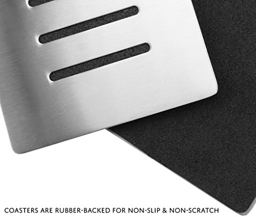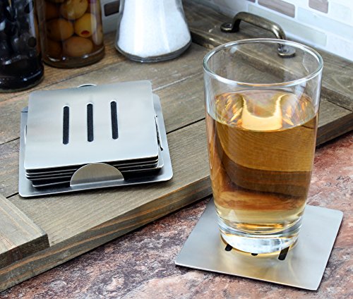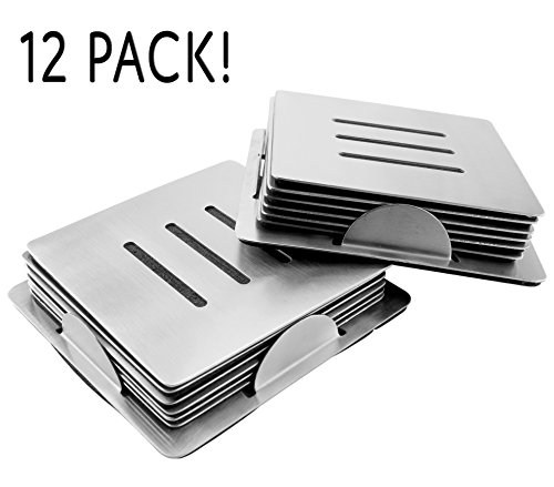 -. Brand : Cornucopia Brands -. Color : Silver -. EAN : 0651174987330 -. Feature : VALUE PACK: You receive 12 square stainless steel coasters with two stainless steel matching holders which each holds 6 coasters / RUBBER-BACKED: Coasters are rubber-backed for non-slip & non-scratch / BRUSHED STAINLESS STEEL: Won't show fingerprints / PROTECT YOUR FURNITURE: Rubber-backed grey coasters keep your furniture safe from drips & scratches, heat & cold / USE & GIFT: 2 separate sets of 6 so one to use & one to share; or have one on each end table in your home -. NumberOfItems : 14 -. PackageQuantity : 2 -. ProductGroup : Kitchen -. ProductTypeName : KITCHEN -. Title : 12-Pack Stainless Steel Coasters w/ Holders (2 Sets of 6 w/ 2 Caddies); Square Metal Drink Coasters -. UPC : 651174987330