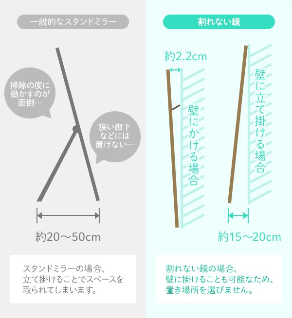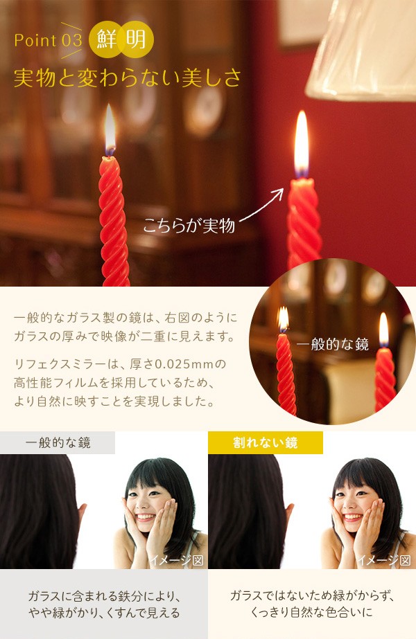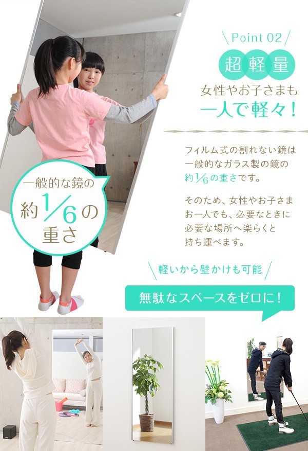 5mm厚のガラス鏡の約1/6と軽量です。市販のフックで簡単に壁に吊下げられます。女性や高齢の方でも手軽に部屋から部屋へ移動が出来ます。硝子ではなくフィルムですので落下したり衝撃を受けても割れたり飛散したりしないので安全です。厚みで映像がダブってしまうガラス鏡に比べ極薄(0.025mm)のフィルムで像を反射するのでゴーストが無く鮮明にくっきりと映し出します。高透明なフィルムを使用していますので肌の色が自然に映ります。反射率が83%と高く鮮明に映し出します。