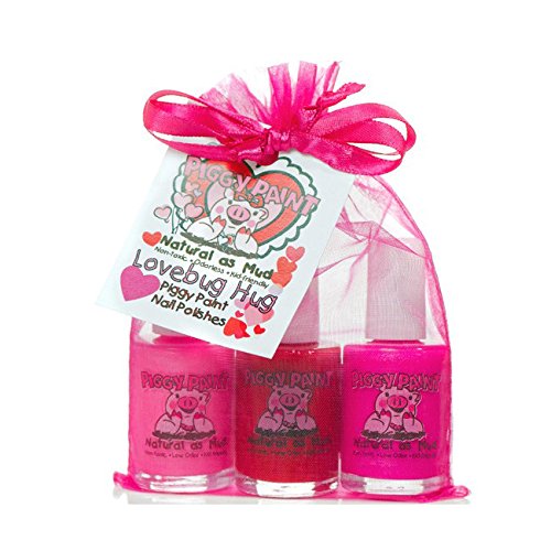 Studio : Piggy Paint Publisher : Piggy Paint Binding : Toy Product Description Lovebug Hug Gift Set Includes:Sometimes Sweet Nail Polish (Red), .5 fl. oz.Jazz it Up (Shimmery Pink), .5 fl oz.LOL (Hot Pink), .5 fl oz.UsageWash hands with soap and water. Apply 2-3 thin coats of Piggy Paint. Allow to air dry for 60 seconds or blow dry polished nails for 1 minute with hair dryer set on warm heat/low blower setting. 0