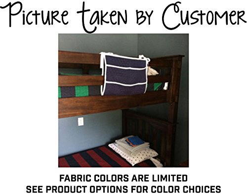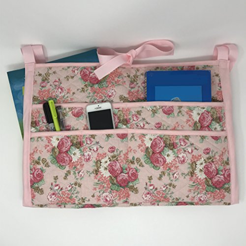 - Very Convenient Hanging Bedside Caddy for holding a tv remote, phone, water bottle, headphones, school books, baby bottles, or more. Made with Double Sided Quilted Fabric, Bias Tape Trim, and 3 Sets of Grosgrain Ribbon.