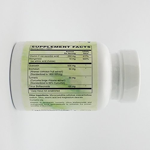 -. Feature : 500 mg of quercetin, a potent bioflavonoid known to support the body in the presence of allergens and other immune and inflammatory triggers. Contains vitamin C which works synergistically with quercetin. Bromelain a natural plant-derived enzyme. Turmeric a potent plant-derived compound to help support a natural anti- inflammatory response. Citrus bioflavonoids work synergisticallywith quercetin and vitamin C. / Quercetin helps to stabilize the mast cell release of histamine. Histamine is a potent chemical secreted in response to allergens and inflammatory mediators, causing the characteristic symp associated with allergies and inflammation. Vitamin C has been shown to neutralize some of the effects of histamine, and those individuals with allergies tend to have low levels of vitamin C, and therefore, an increased requirement. / Bromelain is a naturally-occurring enzyme in pineapple. It is effective for supporting a healthy anti-inflammatory response by helping to regulate the production of prostaglandins involved in the inflammatory process. / Turmeric contains active compounds known as curcuminoids which have potent antioxidant and anti-inflammatory properties. Citrus bioflavonoids help support the absorption and utilization of vitamin C, provide antioxidant support and support the structure of blood vessels and other soft tissue. / Quality and Potency Guaranteed