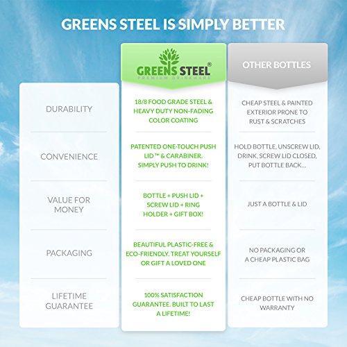 ✅ #1 PREMIUM QUALITY - Other companies use a cheap 201 steel & painted finish. Greens Steel bottles are made from rust-resistant 304 steel imparting NO unwanted flavors. Powder coating means your bottle is easy to grip, won't rust or fade & will maintain its stylish colorful design.