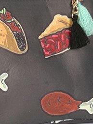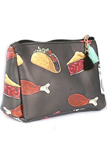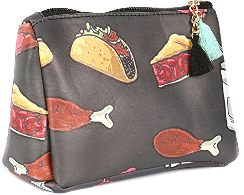 Product Description BAG ACCESSORY FOOD PRINT VINYL POUCH WALLET TACO CHERRY PIE CHICKEN LEG CHOCOLATE BAR ZIPPER TASSEL CHARM ONE SIZE 7 INCH WIDE 5 INCH TALL 0