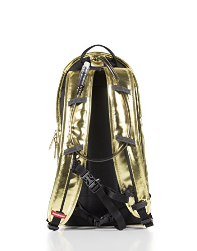 Exterior Dimensions: 16.5" x 5" x 11.5" (Festival approved size) Metallic PU leather Large front zipper compartment (1" deep) with 2 interior slip pockets Small front zipper compartment (1" deep) Main zipper commitment Adjustable waist strap with buckle Back panel slip pocket for waist strap concealment Adjustable Straps for custom sizing Interior Water-pouch sleeve 2.0 Liter water pouch with hose includedFeature