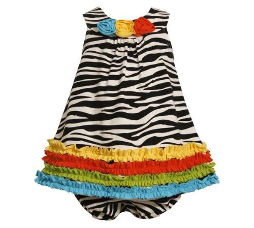 -. Feature : Adorable dress from Bonnie Baby (line from Bonnie Jean). / This sleeveless dress features zebra knit P.R.Ints throughout, multi-color rolled flowers below the u-neckline,multi-color rusching trims at hem, and button back closure. Comes with a coordinating panty. / Dress is 95% cotton & 5% spandex.