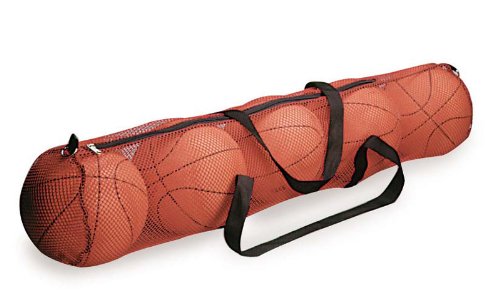 -. Feature : Heavy Duty Mesh ball bag holds up to 5 basketballs. / 38" x 10" tube design. / Full opening zipper for easy access. / Carry handles for easy transport. / Black mesh and handles.