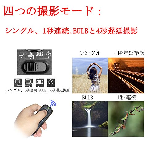 -. Feature : 1.16チャンネル使用可能に。サポートシングル、連続、BULBと遅延撮影。 / 2.リモートコントロール距離はオープンエリアデ100mにまで達することができる。 / 3.FSK方式と世界的な自由な2.4GHzの周波数、より信頼性の高いパフォーマンスを使用してください。 / 4.AAA電池を使用し、より手頃な価格で購入。先進なサテン仕上げプロセスを採用して、もっとファション、きれいです。 / 5.NikonD3100/D3200/D3300/D5000/D5100/D5200/D5300/D5500/D90/D7000/D7100/D7200/D600/D610/D750/DF/Nikon1V3に対応する。