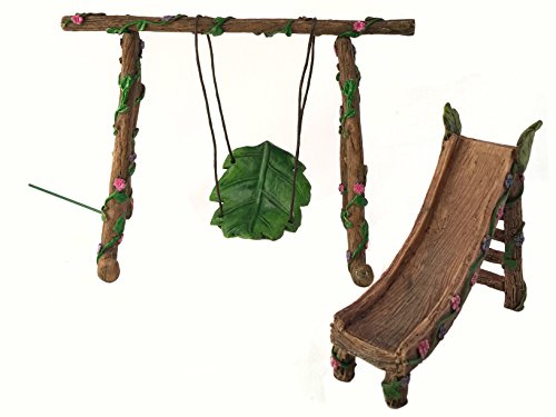 Includes one miniature swing and one miniature slide that is adorned with pink and purple flowers, green vines and leaves for your fairies, gnomes and fairy garden. Does not include other figurines or accessories which might be showing in product images for display purposes