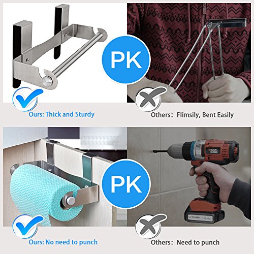 - No Screwing Needed: This kitchen towel holder is really easy to install,there is no screwing hammering or holes to be drilled,just simply slides onto your cabinets,then it works! This hanger is a perfect gadget in the kitchen to replace a countertop holder,got the paper towels off the surface and kept them from accidentally getting wet.If you have a limited space, this paper towel rack is a good option for you to clear up your counter and free up space