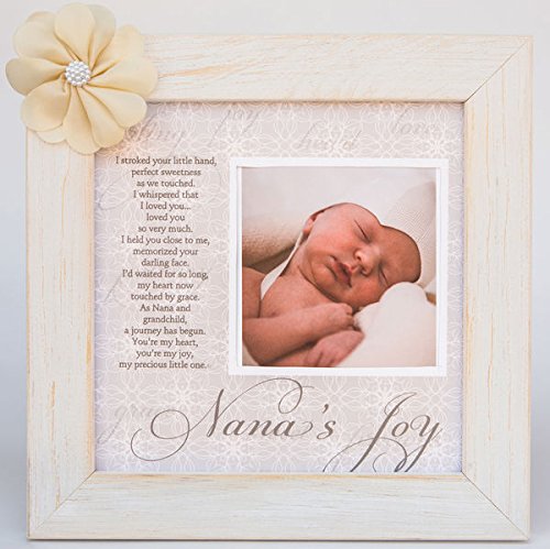 -. Binding : Baby Product -. Brand : The Grandparent Gift Co. -. Color : White -. EAN : 0667788304623 -. Feature : 10.25 x 10.25 distressed white wood frame with silk flower accent / Nana's Joy p and photo opening / Perfect for Mother's Day, Birthday, New Baby or Christmas / Wall or table frame / Space for photo of baby -. IsAdultProduct : 0 -. Label : Grandparent Gift Co. -. Manufacturer : Grandparent Gift Co. -. PackageQuantity : 1 -. ProductGroup : Baby Product -. ProductTypeName : BABY_PRODUCT -. Publisher : Grandparent Gift Co. -. Studio : Grandparent Gift Co. -. Title : Nana's Joy Picture Frame with Poetry -. UPC : 667788304623