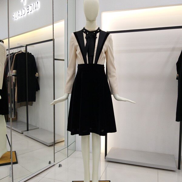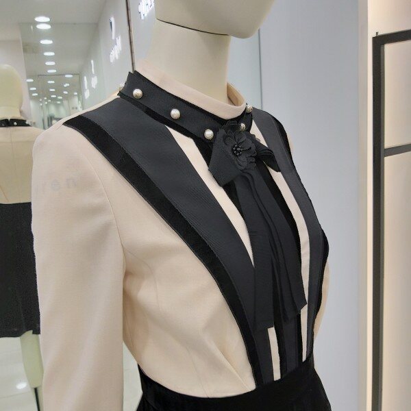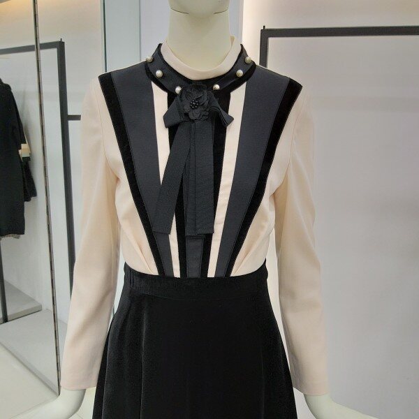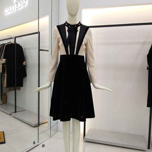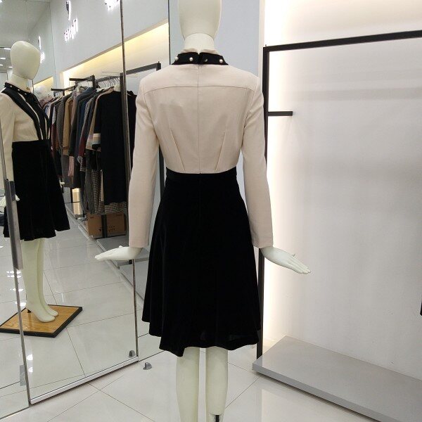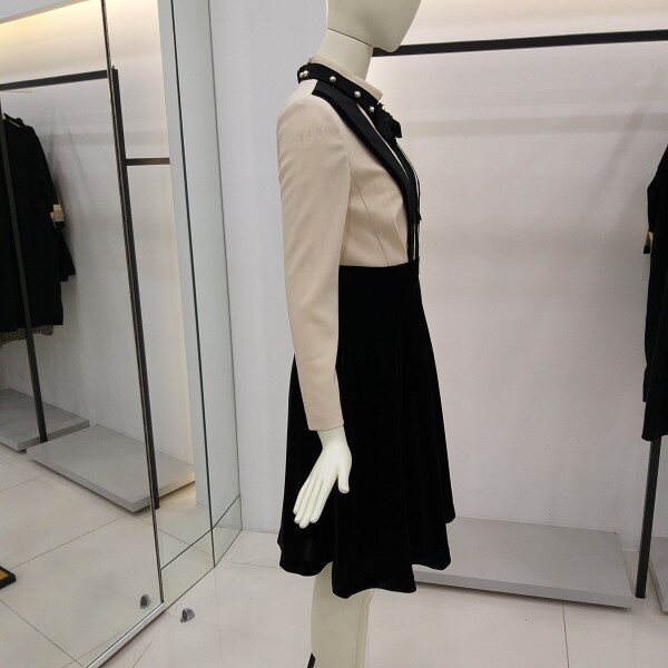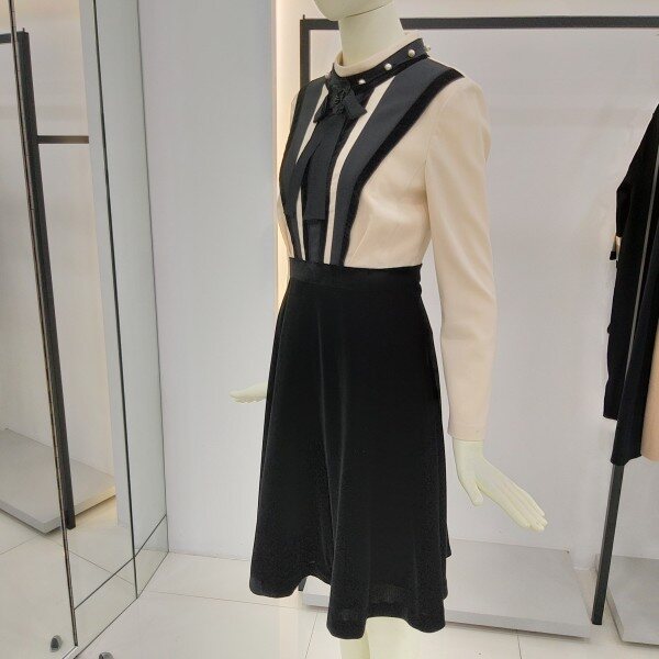 티렌 진주장식으로 고급진 느낌과 벨벳소재와 플레어라인스커트에 망사로 이중처리한 여성스러운플레어 원피스입니다