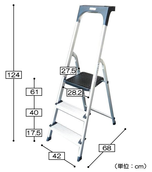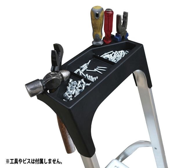 | スリムな作りで、狭い場所でもご使用いただけます。天板と踏ざんは幅広く、滑りづらく仕上げました。便利な小物トレーと工具穴付きです。 |
