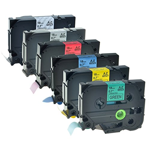 GREENCYCLE TZe TZ 141 241 441 541 641 741 Laminated Tape Black On Clear/White/Red/Blue/Yellow/Green 18mm for Brother P-Touch Label Makers & Printers (6 Pack,TZE141 TZE241 TZE441 TZE541 TZE641 TZE741)