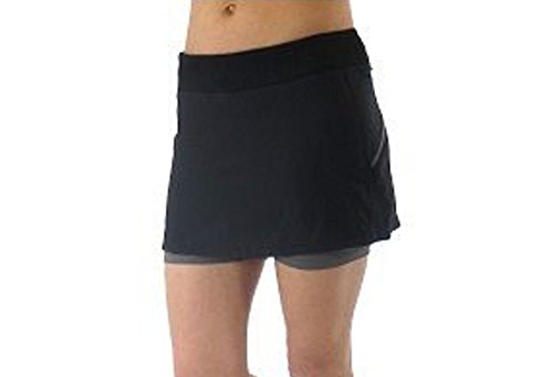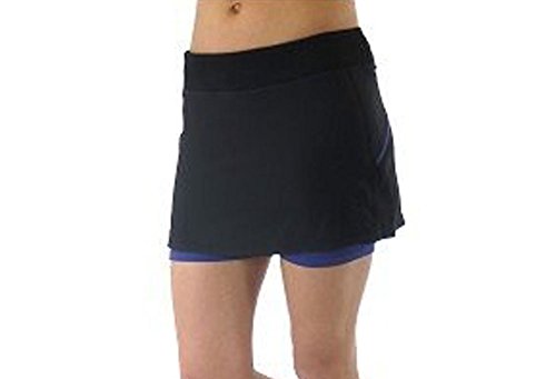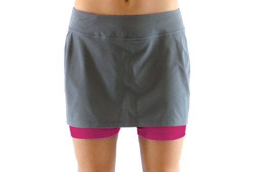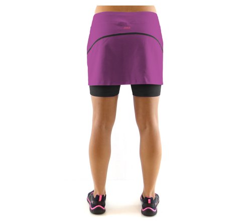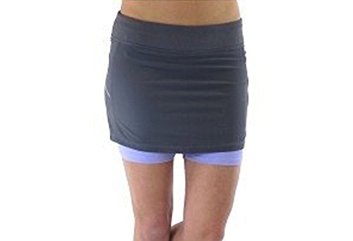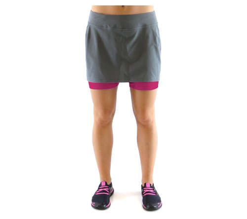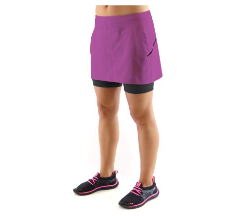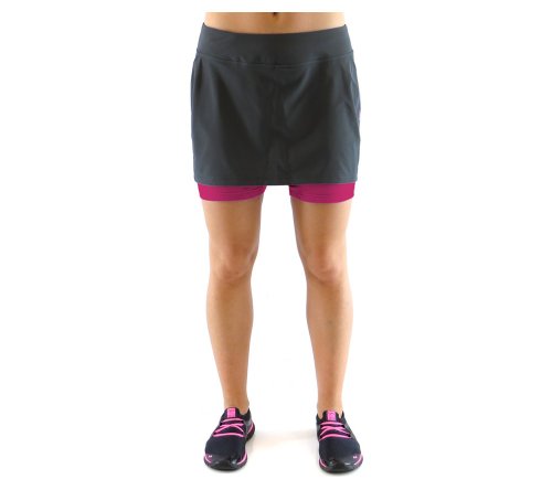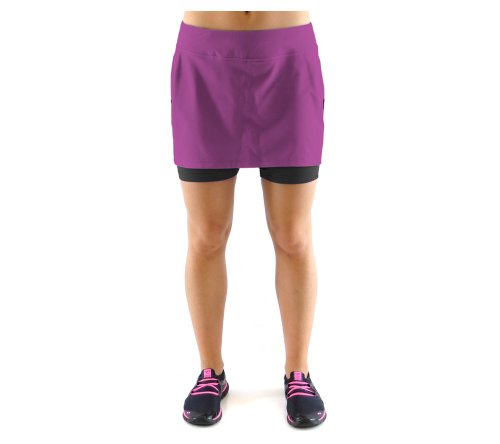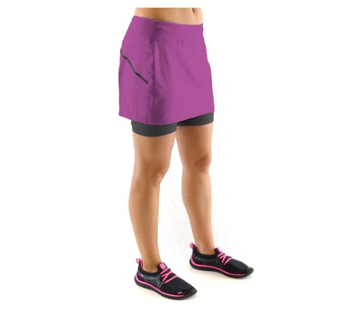 Running skirt with built in short liner. Wide waistband with side and back yoke panel detail. Tagless label at back waist. Hidden pocket on leg. Ryka heat seal logo.